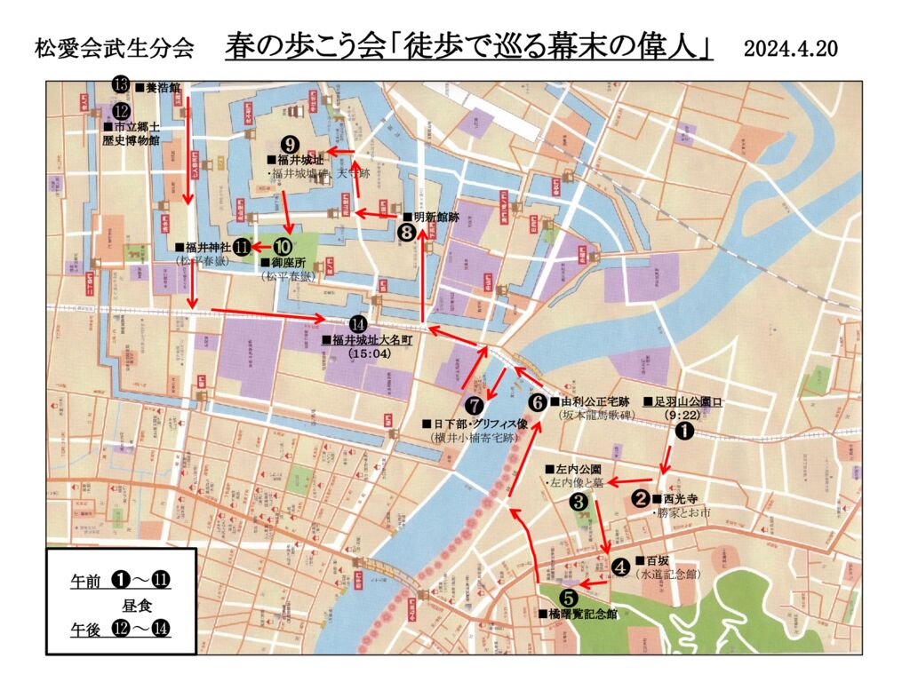 - 福井鉄道(北府駅:きたごう、越前市)~足羽山公園口(福井市)~足羽山周辺~跡(由利公正、横井小楠、明新館、福井城跡)~養浩館~福井駅 8時30分 ~13時30分