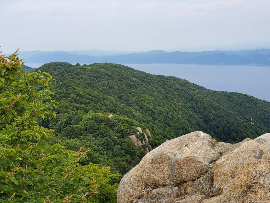 - 花崗岩の巨岩が山中ゴロゴロしていてビックリ、階段が多い山であったが、登山道は良く整備(花崗岩が風化・浸食されていて登山道の維持が大変)されているいて、尾根が岩山のため絶壁になっていて眺望が抜群でリアス式海岸・海を挟んでの山々の景色にて、十分満足できました。