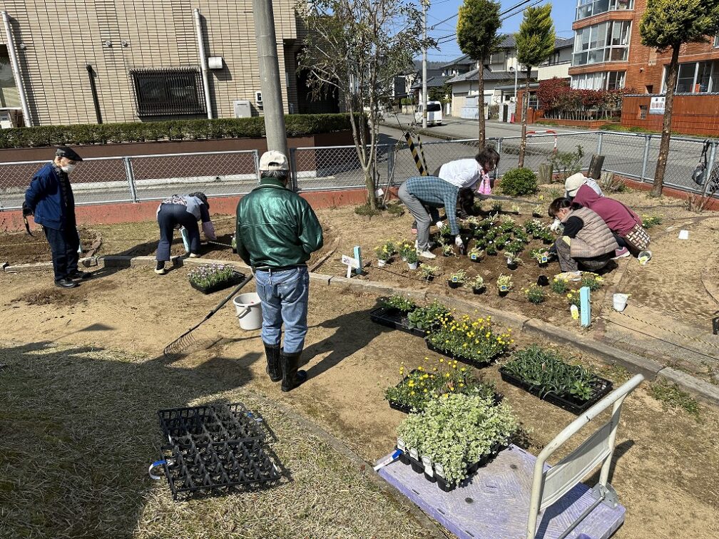 定年退職後、付近を散歩していますと、広い公園で花壇整備・木々剪定・備品補修・など男女十数人が活動をされており、“公園友の会”に入会をさそわれ、以後10数年経過しました。(写真はその活動の一コマです)