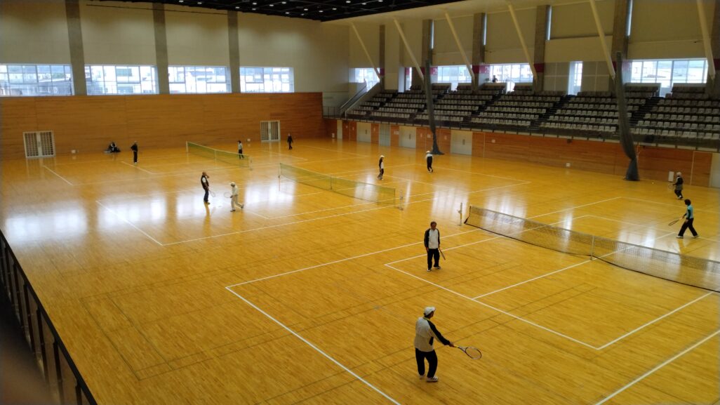 - 紹介 例会(月~金曜平日午前中)は冬場、野外コート(12月~2月まで閉鎖)は降雪のため使用できなくなるため、野外コートに隣接している体育館にて行います。今年は、体育館管理者が変わったため、利用できるコート面数は2面(従来基本1団体1面)が確定され、状況により3面(メイン体育館貸し切り状態)が可能になり、活動がやり易くなっています。