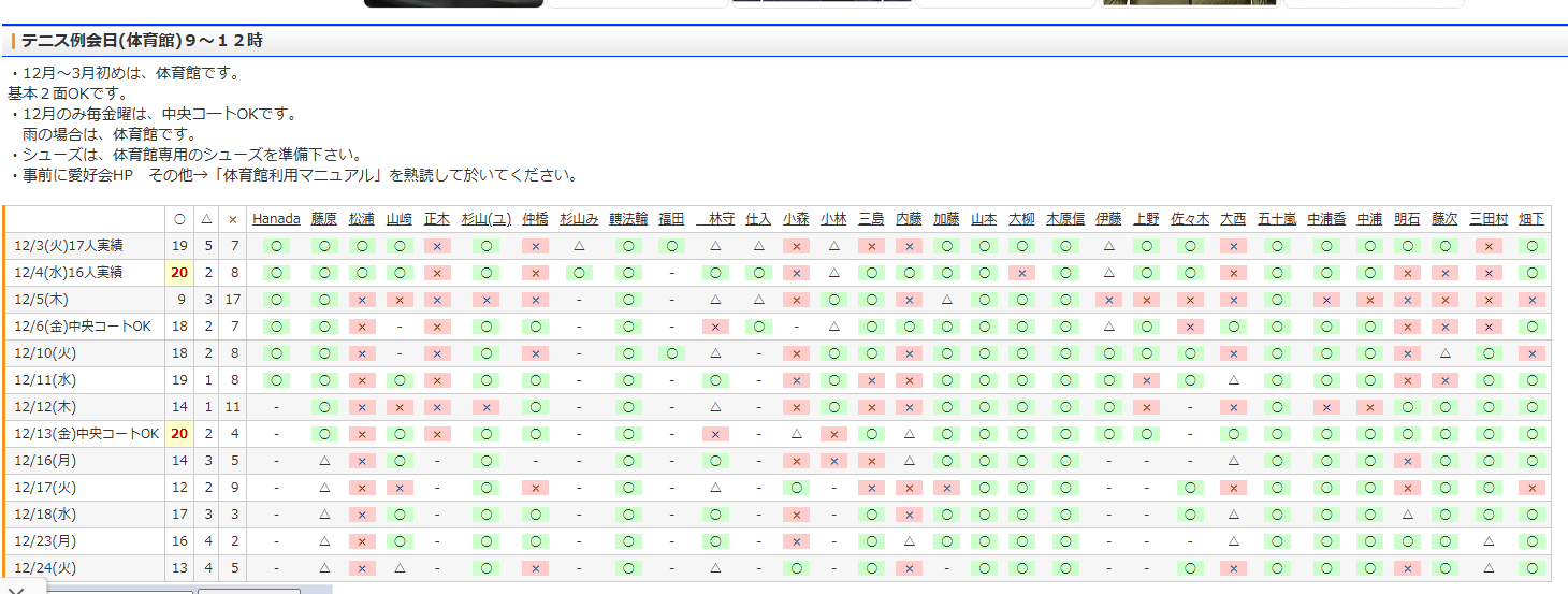 - 今年は、昨年に比べて、参加人数が増えていますが(現在伝助登録者数31人)、2~3面使えるので何とか回っています。現在の参加予定状況表を次に示します。