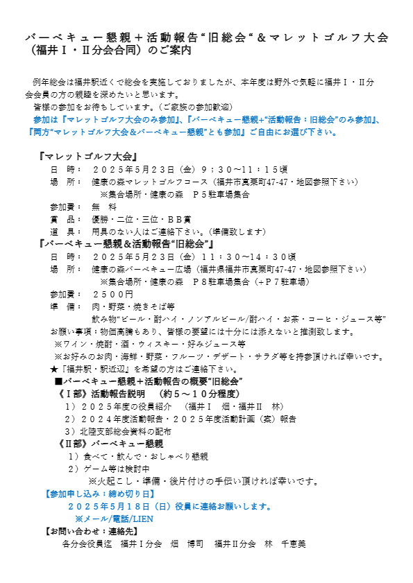 例年総会は福井駅近くで総会を実施しておりましたが、本年度は野外で気軽に福井Ⅰ・Ⅱ分
