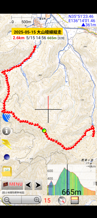 - 行程 登山口(文室町)~巡視路~鉄塔~大山~603mピーク~牧谷越~下山口(萱谷町)