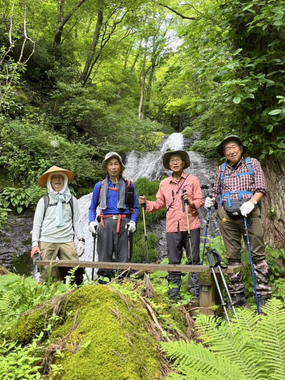 - コースには、見事な虎斑の滝があり、道すがら私の好物の葉ワサビがあるので、適当に採りながら、例の如くワイワイガヤガヤと楽しく登りました。