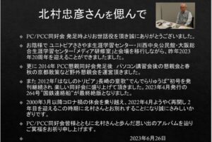 PC同好会/PCC懇親同好会の発足時より、世話役としてご活躍ご尽力頂いた北村忠彦さんを偲び、黙祷を捧げた後、動画を交えた思い出写真のスライド映像を観賞、PC同好会/PCC懇親会の開催履歴を瀨川世話役より紹介頂き、テーブルに笑顔の写真とお花とワンカップを供えご冥福をお祈りいたしました。