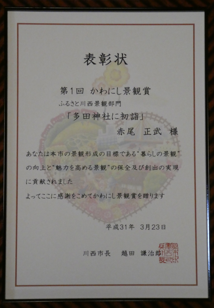 2019年3月23日(土)キセラ川西プラザにて、「第1回かわにし景観賞」の表彰式が開催されました。そのふるさと川西景観部門において、はがき絵の『多田神社に初詣』が、市の景観の魅力を発信している作品として表彰されました。今後も絵画制作に精進してまいります。