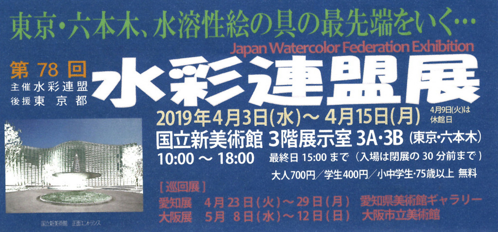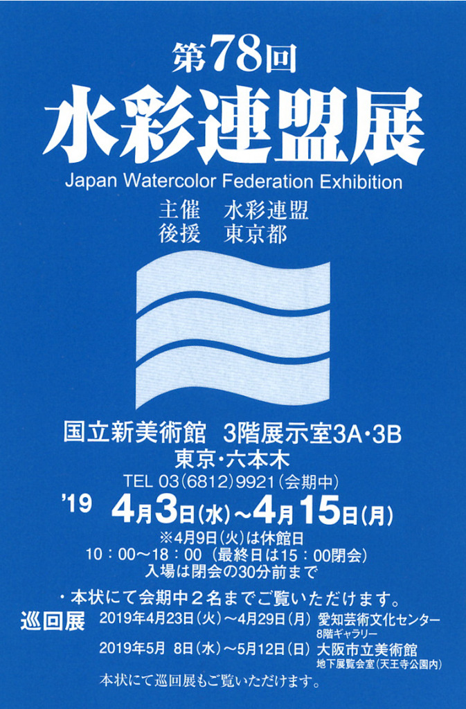 2019.04.9 会員だより 「第78回水彩連盟展」5/8~12 ご案内 松村一雄 東京・六本木の国立新美術館にて開催される第78回水彩連盟展に入選いたしましたのでご高覧をお願い申し上げます。(尼崎市 松村一雄) 巡回展 ◆会期:2019年5月8日(水)~12日(日) 10:00~18:00 ◆会場:大阪市立美術館 地下展覧会室(天王寺公園内) 出展作品「朝光」 投稿者: akaohyogoe 会員だより コメント: 0