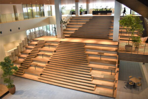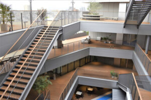 ◆1~2階は、共用スペース(X-PLAZA)地域や社外にも開放される高さ9メートル以上のオープンスペース。イベント時には観覧席にも使える大階段を設置。2024年度には(門真郵便局)や飲食、コンビニなど商業施設入居、2階デッキと西三荘駅が直結する予定。
