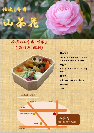 2019.09.3 パソコン同好会, 同好会活動 PC同好会 8月度 Bコース 実施報告 ◆次回日程は「PC同好会」HPへリンクしました。 ここをクリックしてご覧ください! 2019年8月26日(月)Bコース Photoshop Elements4.0 写真画像の編集加工補正 第5章 複数の写真合成の復習完成 P136~158 レイヤーの基本 ①カンバスサイズで余白を設定 ②画像のレイヤー合成 ③半透明レイヤー活用 ④不要部分を背景消しゴムツールで削除 ⑤マジックブラシで抽出切り抜き Word 2016 応用 第2章 写真・図形を使った文章の作成 P104 練習問題仕出し弁当「山茶花」のチラシ作成・印刷完成 ①仕出し弁当画像の背景切り抜き・トリミング ②地図挿入 P247 総合問題 東京夜景案内ポスター作成 原画 ①空 原画 ②道 原画 ③家 ①カンバスサイズ設定 ②道をレイヤー合成 ③家背景切り抜き ④家をコピー貼り付け ⑤サイズ変更配置移動 山茶花弁当 チラシ 東京夜景案内ポスター 投稿者: suzukihyogoe パソコン同好会, 同好会活動 コメント: 0