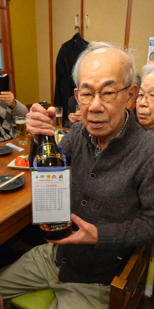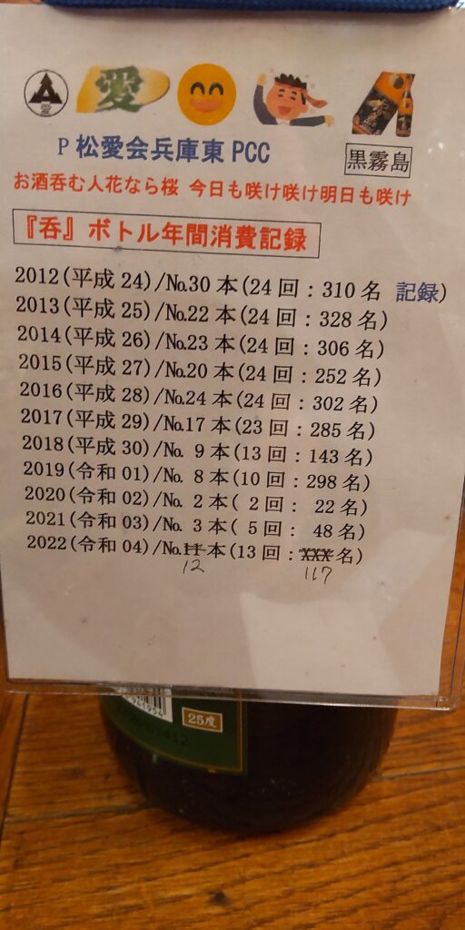 自由参加の懇親会は、12月度本年最終回を迎え 来年度こそ良い年を願い乾杯!「呑」ボトルの年間消費本数の履歴ラベルを見ながら、3年越しのコロナ禍を振り返り健康に過ごせたことに感謝し歓談のひとときを楽しみました。