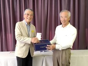 終了後表彰式を行い、佐伯会長からご挨拶を頂き、その後前回優勝者の辻原敏生様から順位発表をして頂きました。 順位賞・ニアピン賞・当日賞、ゴルフ場提供の副賞賞品の授与の後、優勝の矢形敦様からスピーチを頂きました。