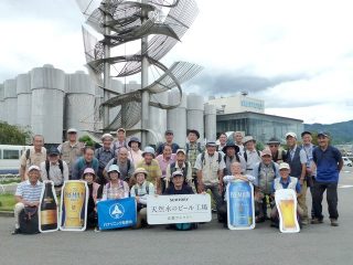 サントリービール工場の玄関前で集合写真