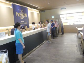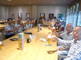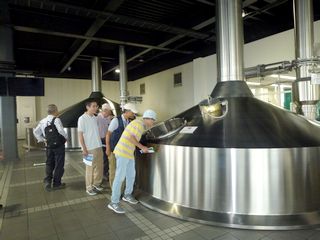 ここでガイドさんとお別れし、待望のサントリービール工場に向かいました。14時10分に到着し、まず玄関前で集合写真を撮り、 ロビーでしばらく休憩した後、構内バスに乗って工場見学を開始しました。麦芽を頂きホップの香りを楽しんだあと、温度の高い部屋での仕込み釜や温度の低い部屋での発酵の窯、それに高速回転で缶にビールが充填される様子も見学しました。最後にお待ちかねの試飲コーナーに行き、 通常のプレミアムモルツ、香りの高いもの、しっかりした味わいのもの3種類を楽しみました。
