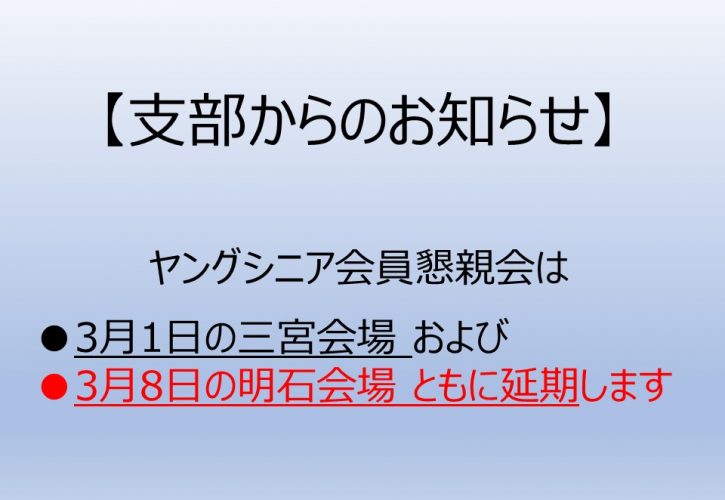 さて、3月1日(日)に三宮で予定していたヤングシニア会員懇親会の延期に引き続き、大変残念なお知らせですが、3月8日(日)に明石で開催の予定をしていましたヤングシニア会員懇親会も、下記の理由により延期させて頂くことにしました。