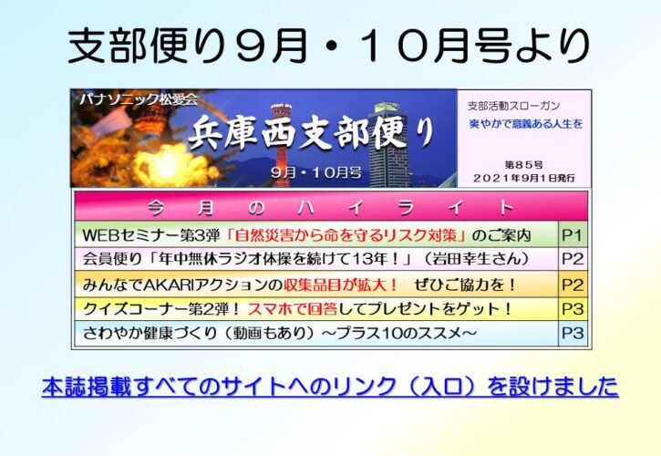 支部便りは9月・10月号より表紙タイトルを刷新し、コンテンツを充実するとともにカラフルな誌面にして会員のみなさまにより楽しんで頂けるようにしております。