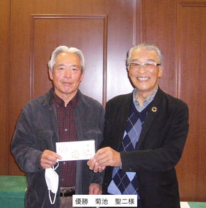 表彰式は、感染対策の施されたコンペルームで、佐伯会長挨拶の後、上位入賞者に商品が手渡されました。その後、優勝された菊池様からスピーチを頂きました。