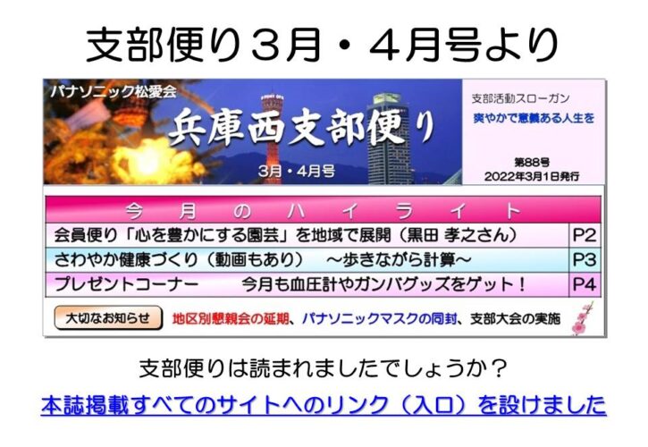 | 1 | 支部長挨拶 のページへ | P1 | 兵庫西支部ホームページの支部長挨拶カテゴリーへ |