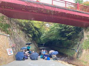 雨の中、11時25分に「愛宕山公園」に到着し休憩後、11時30分に「温泉神社」に向かいました。11時40分に「温泉神社」に到着しましたが、この頃には雨が上がりみなさんほっとしました。参拝後11時45分に「親水広場」に向かいました。そこで、記念写真を撮った後昼食としましたが、この頃からまた雨が降り始めたので、みなさんは橋の下に集まり、傘を差しながらの昼食となりました。