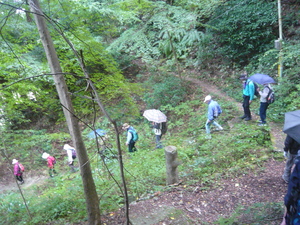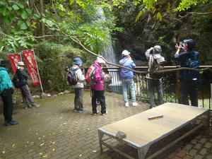 神戸電鉄・「有馬温泉駅」改札口に10時30分に集合し、「太閤橋広場」で代表の挨拶と体操を行い、10時40分に「太閤橋広場」を出発し、「鼓が滝公園」に向かいました。11時00分に「鼓が滝公園」に到着し、マイナスイオンを満喫し11時05分に「愛宕山公園」に向かいました。この頃から雲行きが急にあやしくなり、愛宕山への階段を上がろうとした時に雨が降り始め、傘をさしての歩行となりました。