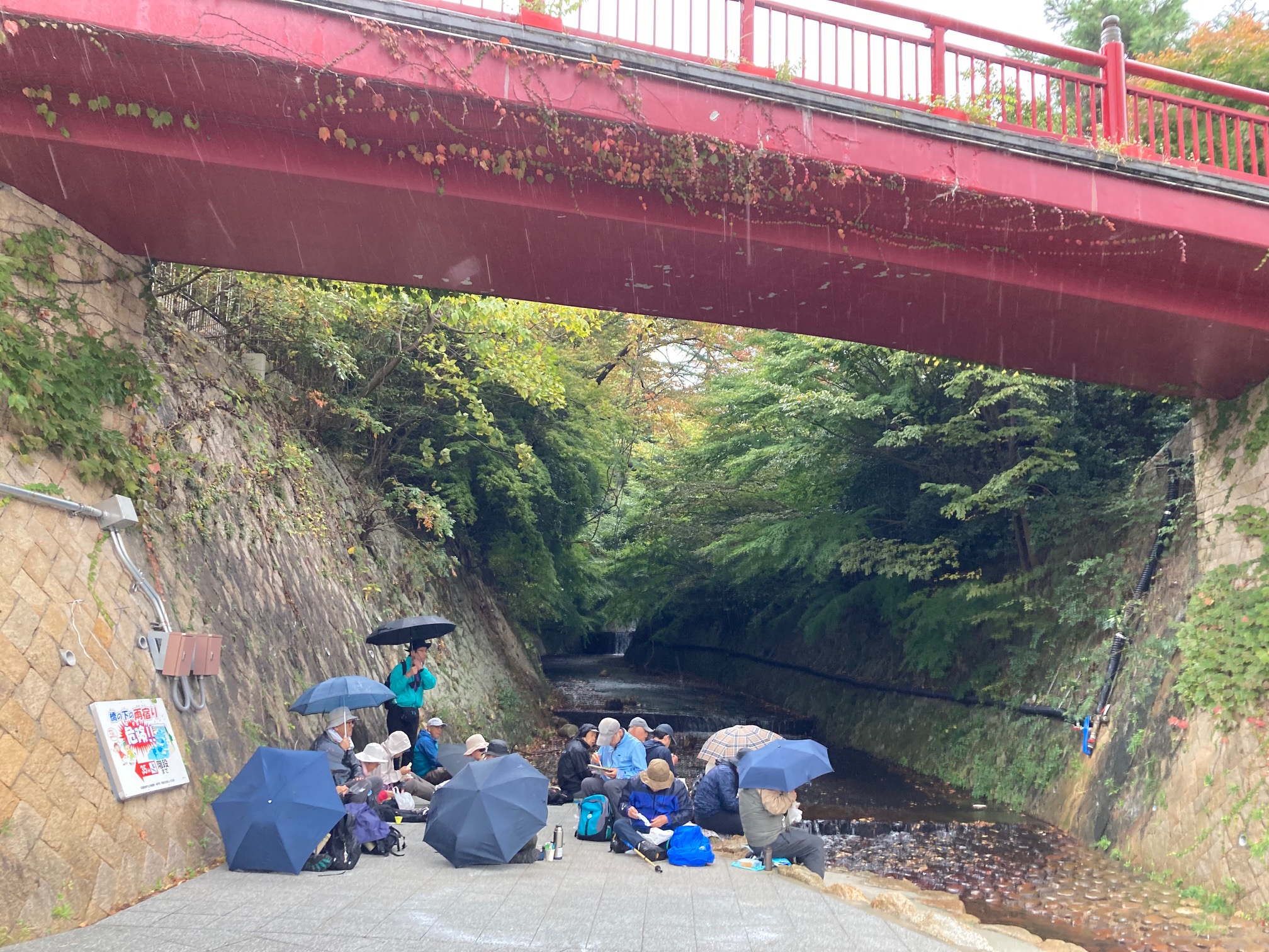 - 橋の下で傘をさしての昼食