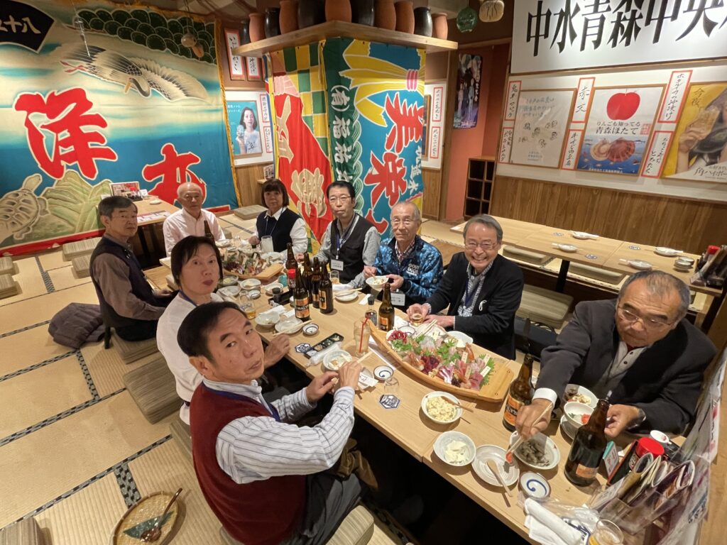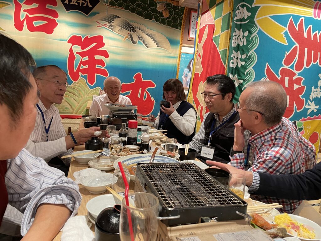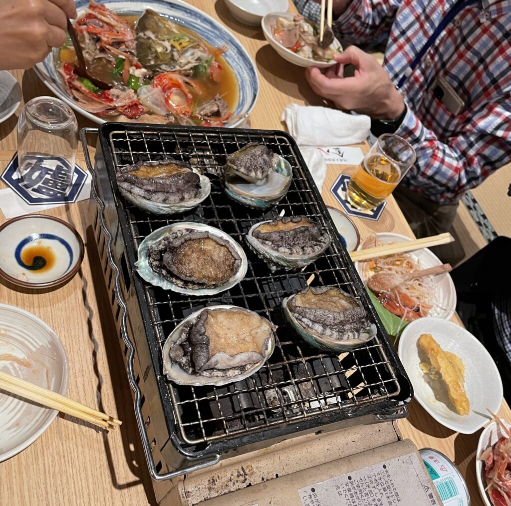 テーブルはやや狭かったのですが、全員一緒に食事とお酒を囲んでの楽しい宴会となりました。料理は舟もり刺身や鯛のアラ炊き等、海鮮中心でしたが、中でも卓上コンロの網に活アワビを丸ごとのせて焼いて食べるという初めての経験をいたしました。焼ける状態が少し残酷のようにも思いましたが、焼き上がりは大変美味しくいただけました。全員の近況報告では、皆さんの現在の仕事、趣味、興味等の状況や気になる、為になる情報もあり大変楽しく情報交換もできたように思います。