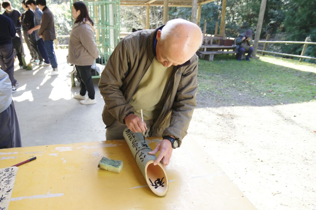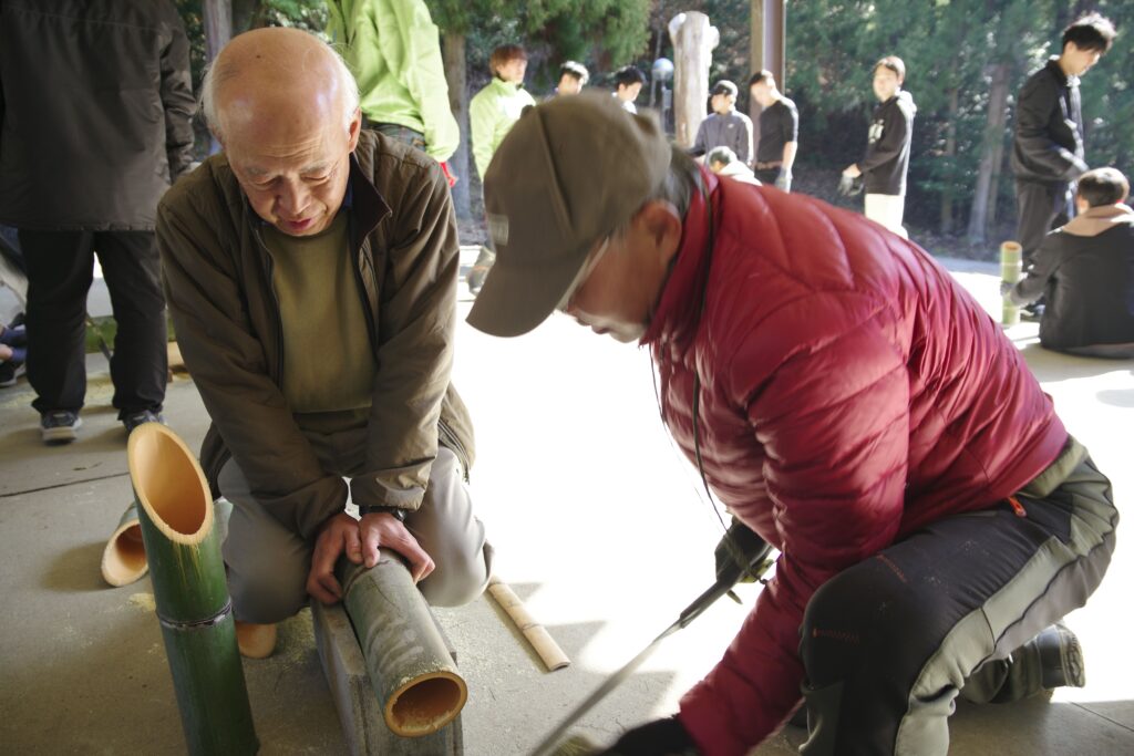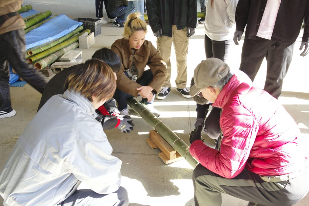 今回も昨年同様にくらしアプライアンス社の新入社員の皆さんが社員研修の一環で参加し、エコリレージャパンのみなさま、松愛会兵庫東支部・兵庫西支部の総勢50名で竹筒を作りました。