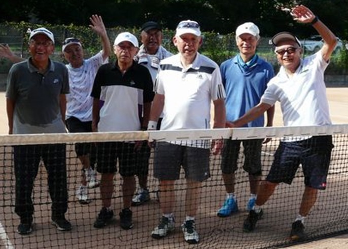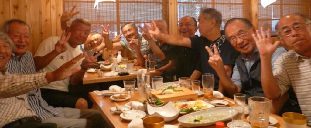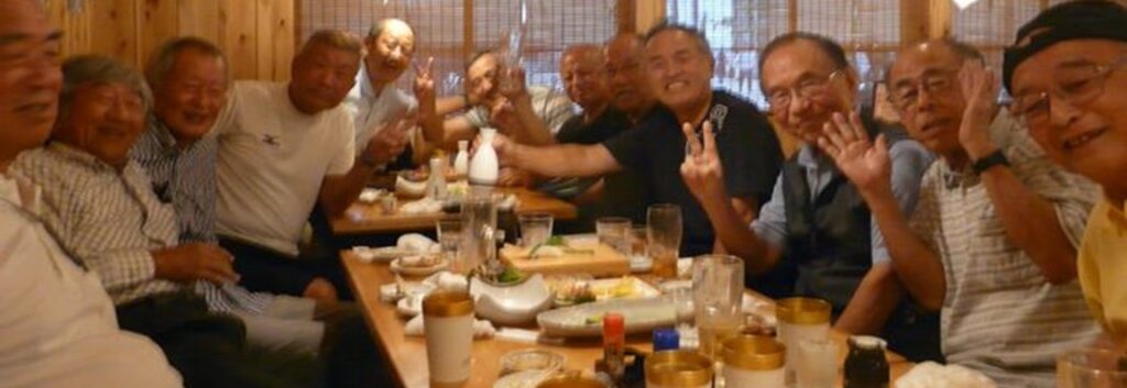 テニス練習日はいつも8名前後、多くても10名程度ですが、この日は飲み放題ということもあって12名がJR灘駅前の店に揃い、体温に近い暑さの中での練習がなかったので皆元気溌剌で宴会に臨みました。