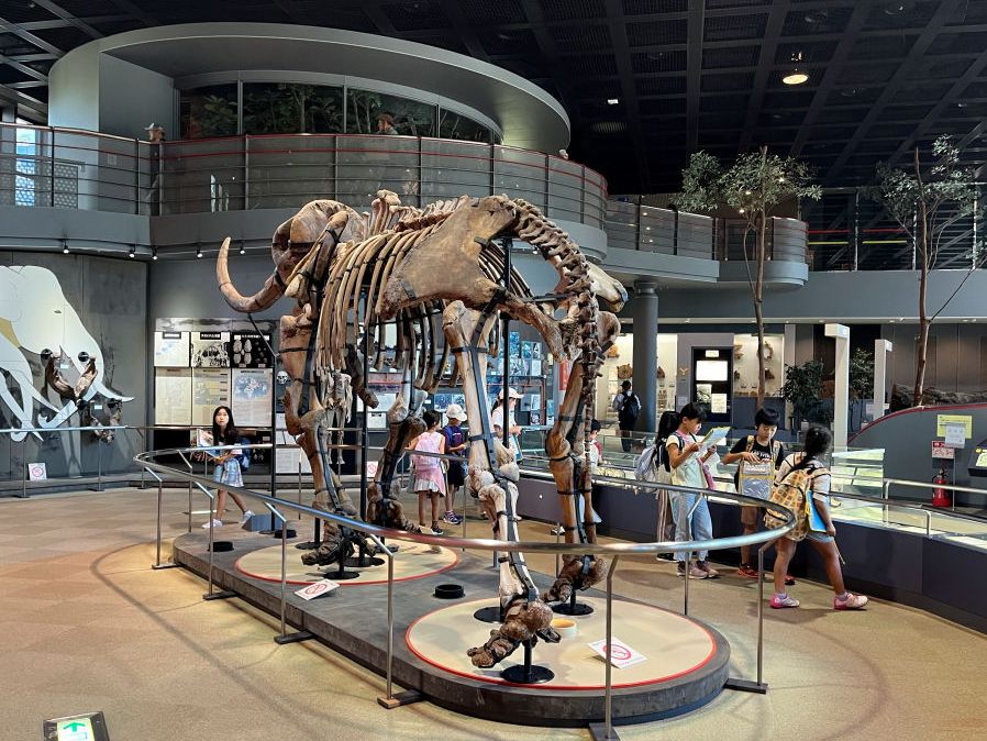 - 恐竜関連の展示が多く、小学生と一緒に見学です