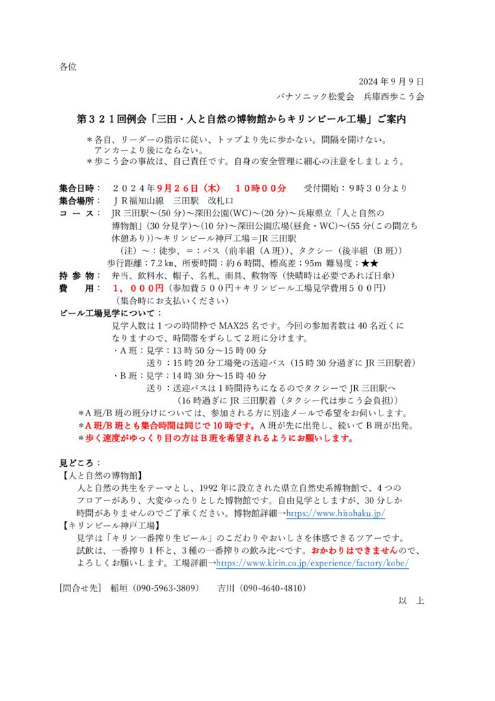 9月26日(木)に9月例会が開催されました。今回は、第321回「三田・人と自然の博物館からキリンビール工場」と題し、天気にも恵まれ、会員31名、世話役6名、総勢37名と大変多くの方に参加いただきました。