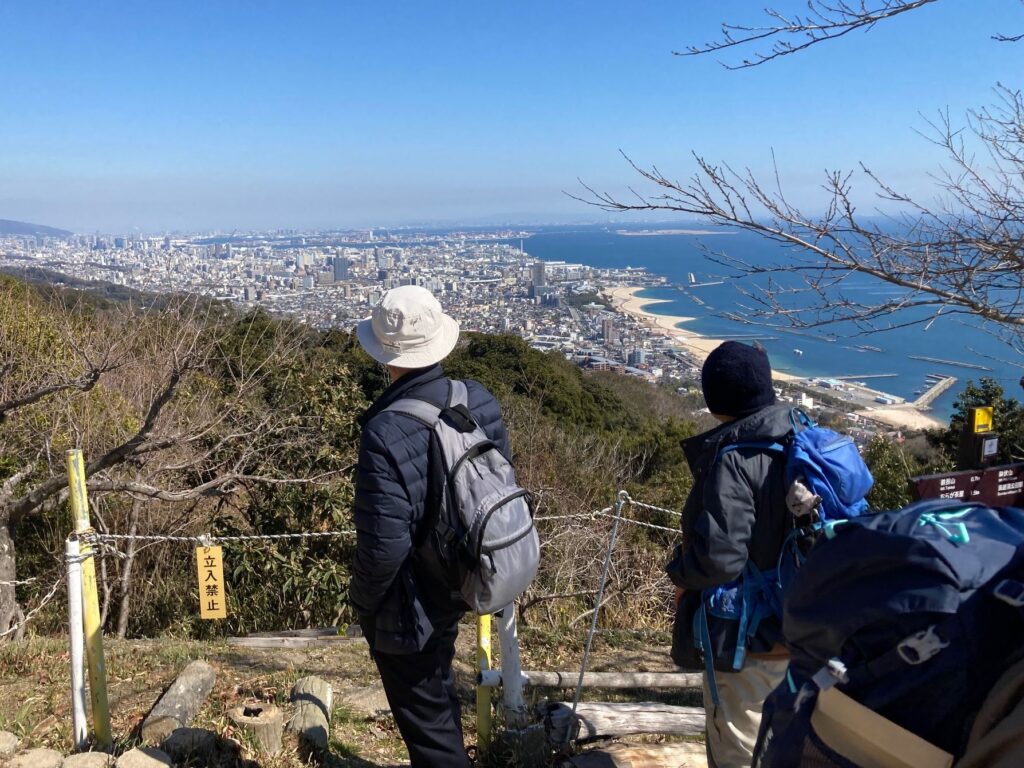 昼食後、12時45分に「旗振山」に向かいました。12時50分に「旗振山」に到着し、山上からの絶景をバックに集合写真を撮り、13時00分に「一ノ谷下山口」に向かい出発しました。