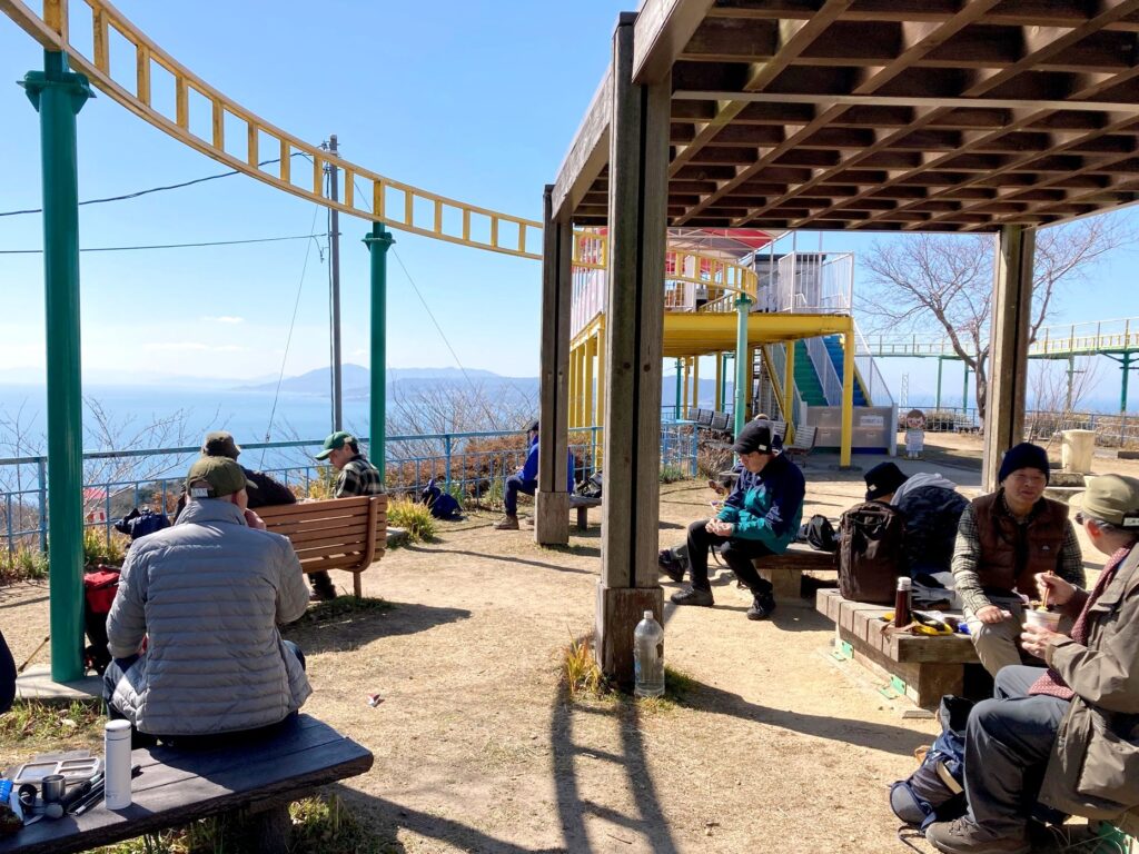 - サイクルモノレール広場で絶景を楽しみながら昼食。気温も上がり風もなく雲一つない最高の天気でした。