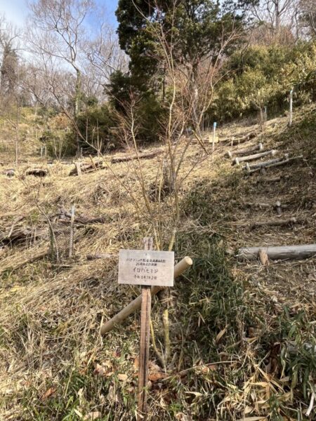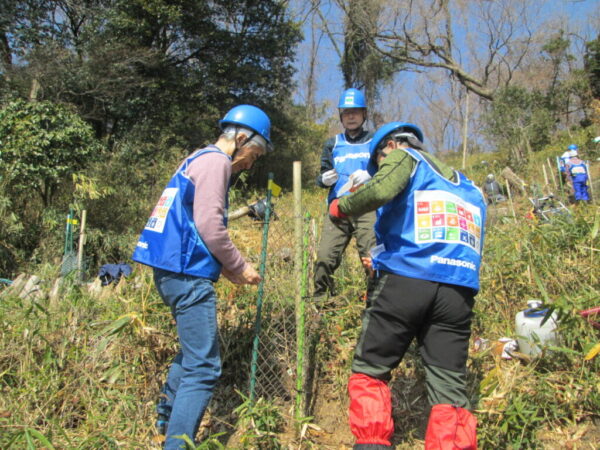 急斜面での足場に注意しながら、支柱の竹を打ち込んで苗木に添え、脇に立てたポールにネットガードを固定、木の名前と植樹担当者の名前を木札に書いて、支柱に括り付けて完成です。