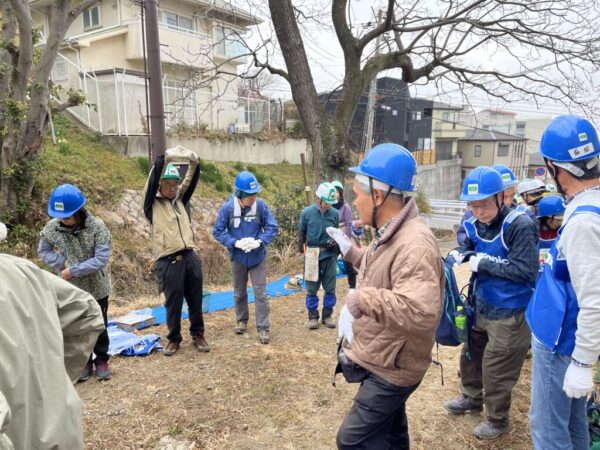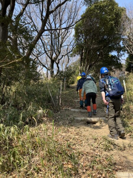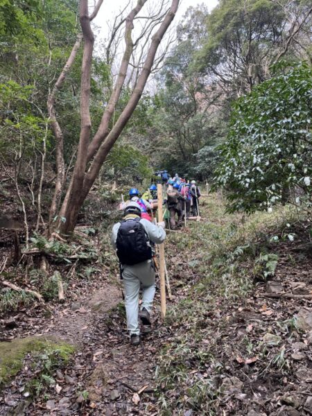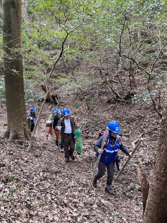 JR甲南山手駅北側広場で出席のチェックを受け、住宅街を抜けて甲南女子大の上の登山道入り口で再集合し、ヘルメットとベストを着用して準備体操の後、苗木や支柱の竹、木杭、スコップ等の道具を分担して担ぎ、落ち葉の積もる登山道を登って、標高220mのベースの休憩地へ。
