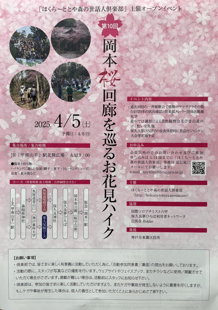 *フォレスター松寿さん関連団体の「ほくら~ととや森の世話人倶楽部」主催で、4/5に開催される「岡本桜回廊を巡るお花見ハイク」のお申込みは、末尾の案内チラシをご確認ください。