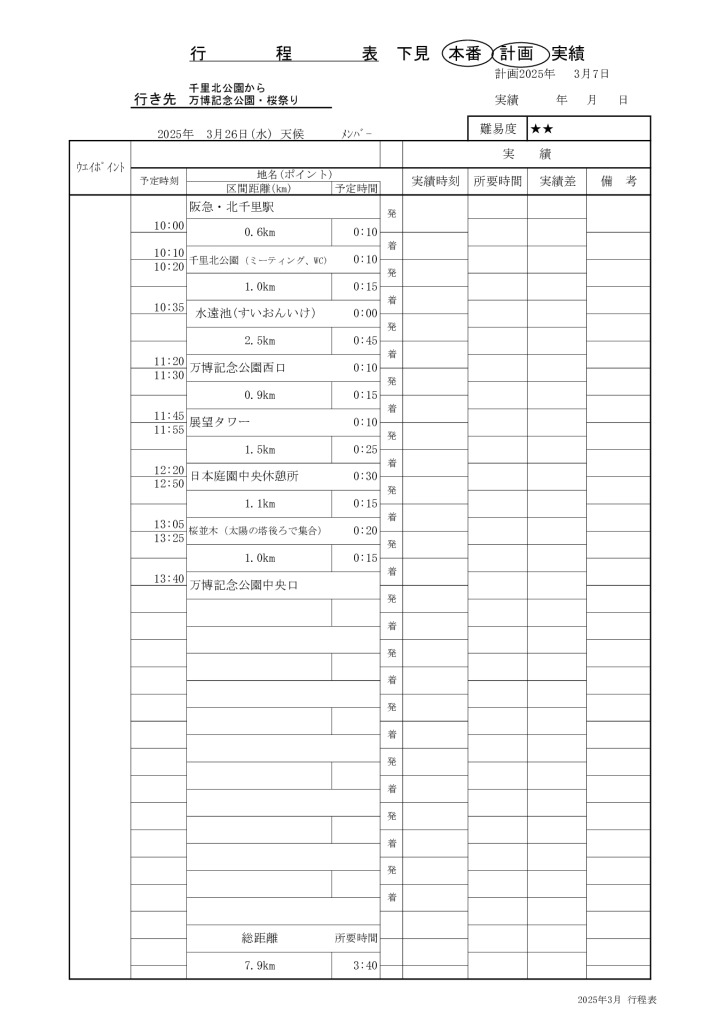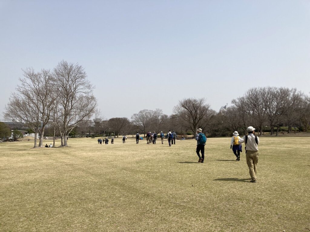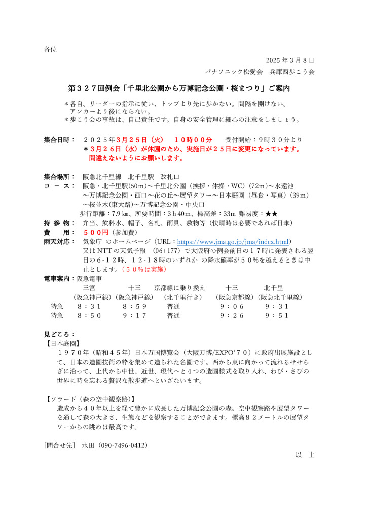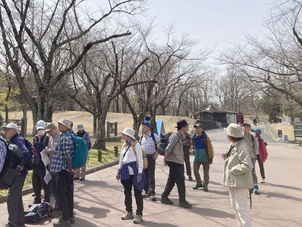 3月25日(火)に3月例会が開催されました。今回は第327回「千里北公園から万博記念公園・桜祭り」と題し、晴天に恵まれ、会員22名、世話役5名、総勢27名と多くの方に参加いただきました。