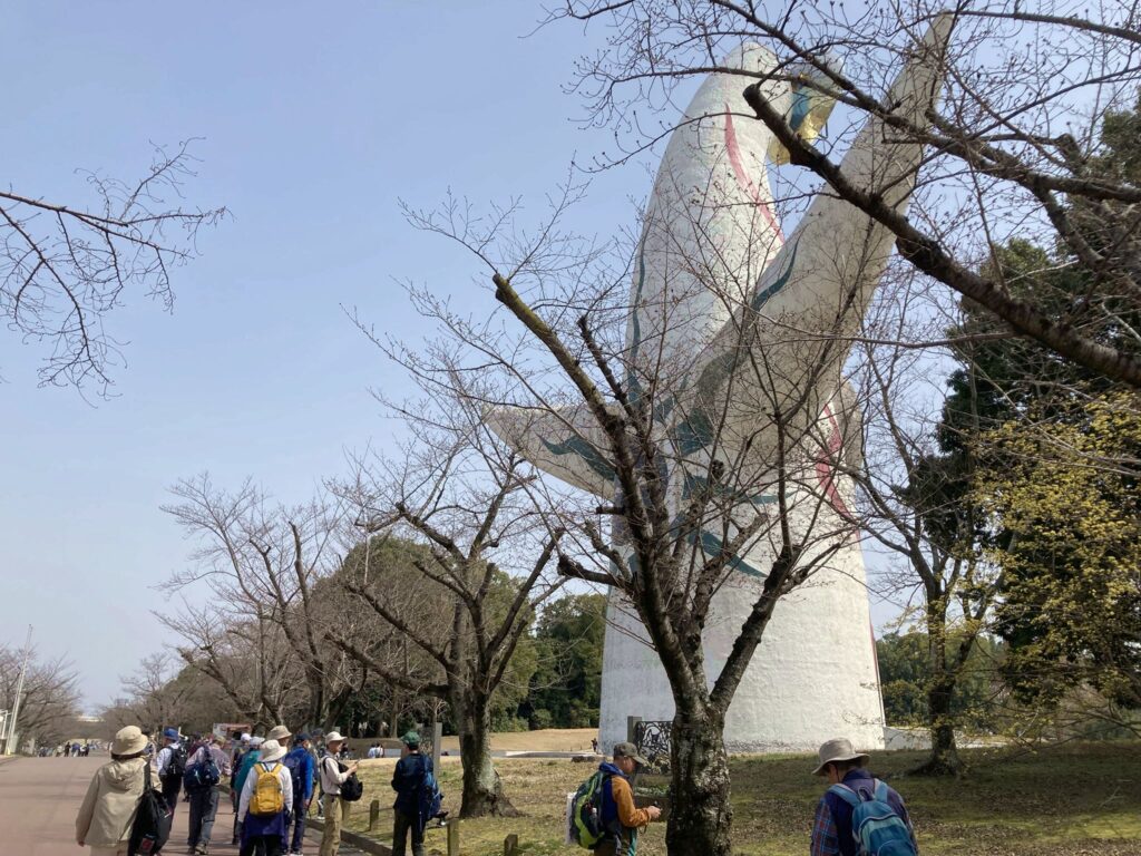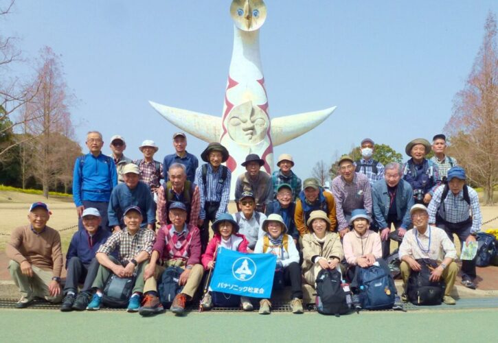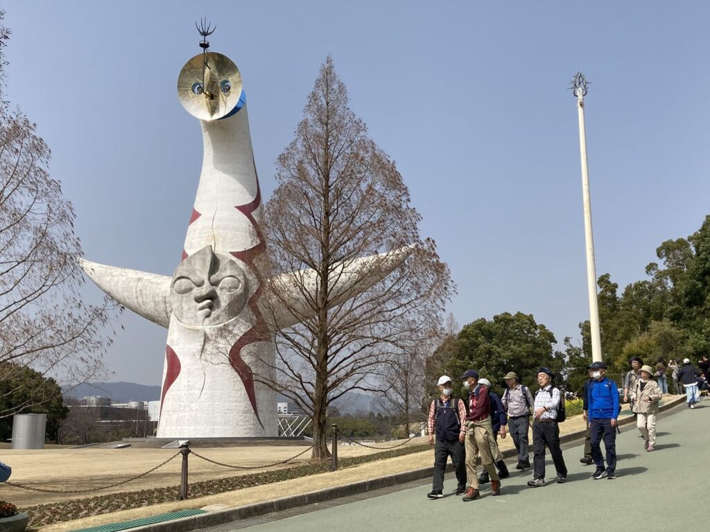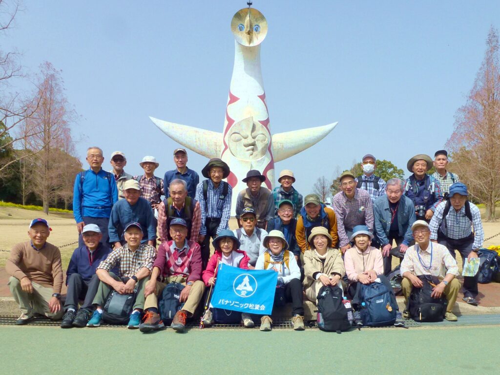 昼食後、日本庭園をバックに集合写真を撮り、13時05分に「万博記念公園中央口」に向かいました。13時20分に「万博記念公園中央口」に到着し、「太陽の塔」をバックに集合写真を撮り、