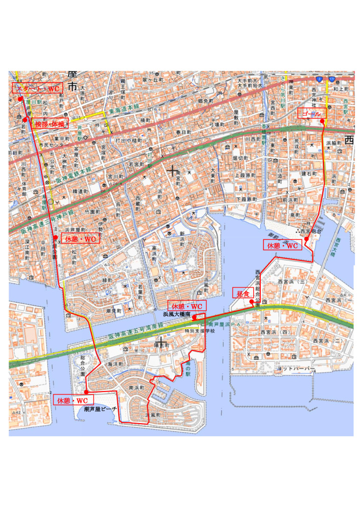 昼食後、12時50分に「西宮浜総合公園」に向かいました。13時10分に「西宮浜総合公園」に到着し、休憩後13時15分に「御前浜公園」に向かいました。13時25分に「御前浜公園」に到着し、休憩後13時30分に「西宮神社」に向かいました。13時50分に「西宮神社」に到着し、そこで解散としました。皆さん大変お疲れさまでした。