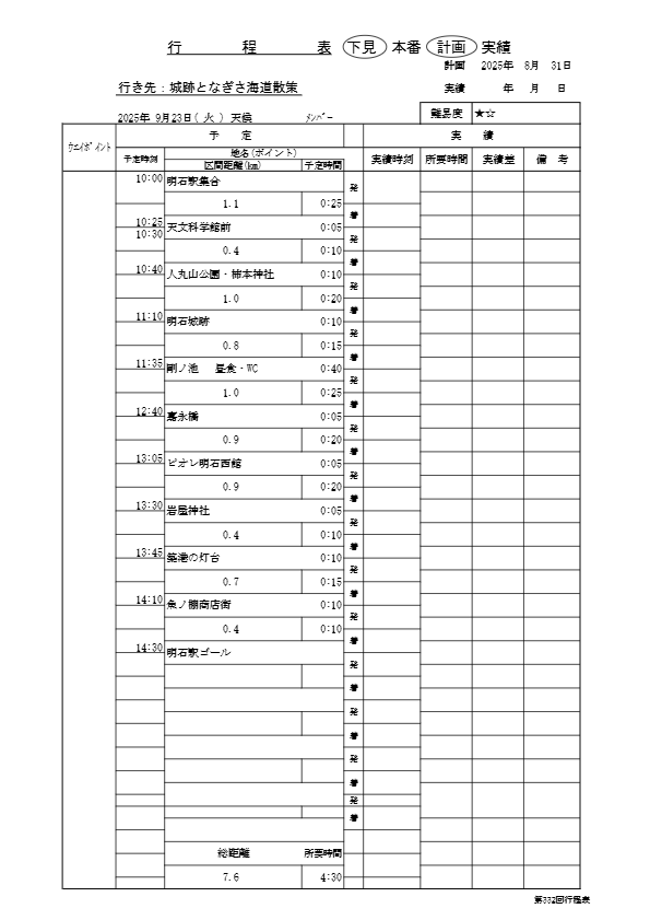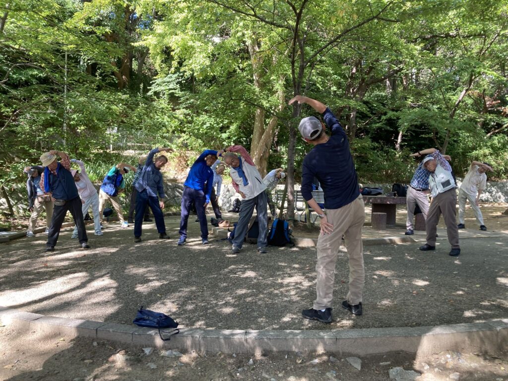 「JR神戸線 明石駅」改札口に10時00分に集合し、「天文科学館前」に向け出発しました。10時25分に「天文科学館前」に到着し、そのまま「人丸山公園・柿本神社」に向かい、10時30分に「人丸山公園・柿本神社」に到着し、そこで、ストレッチをして5分間の休息をしました。