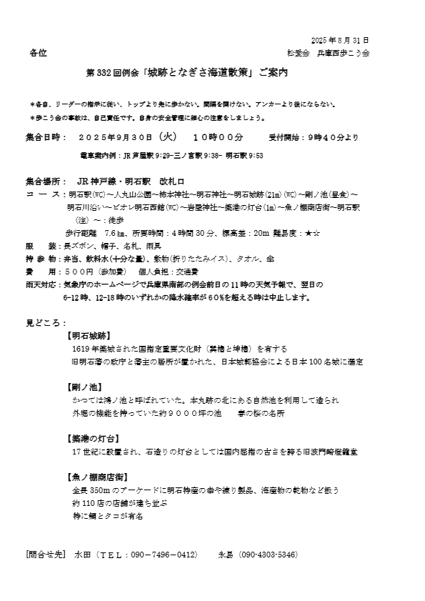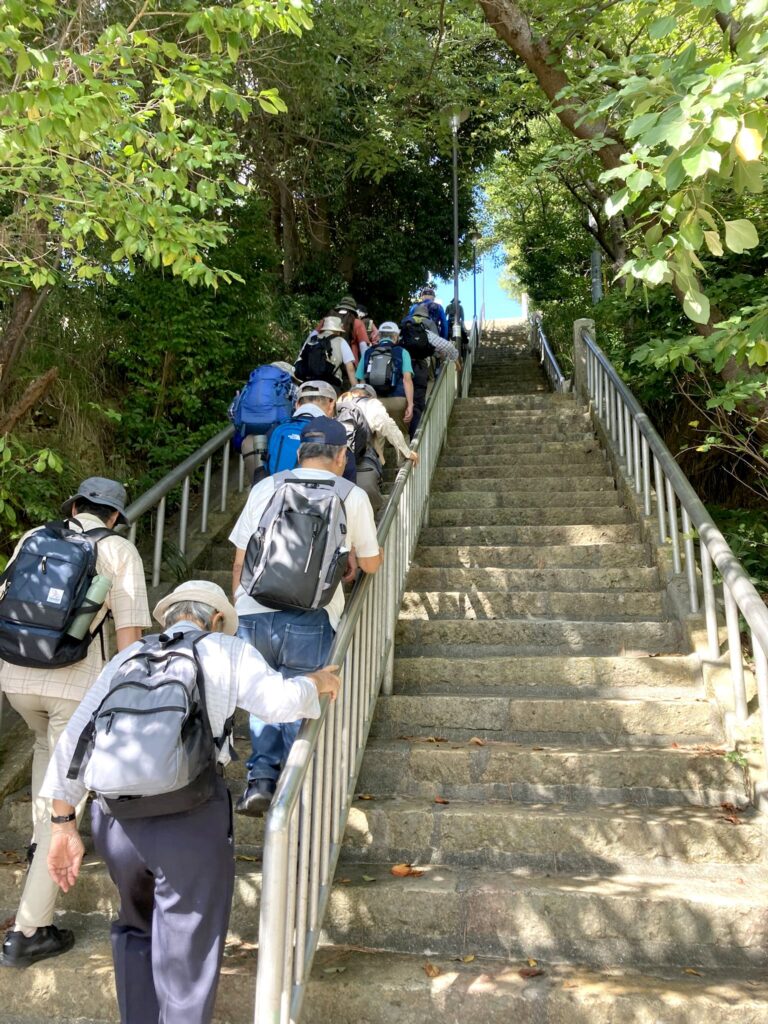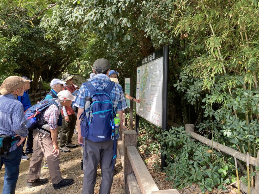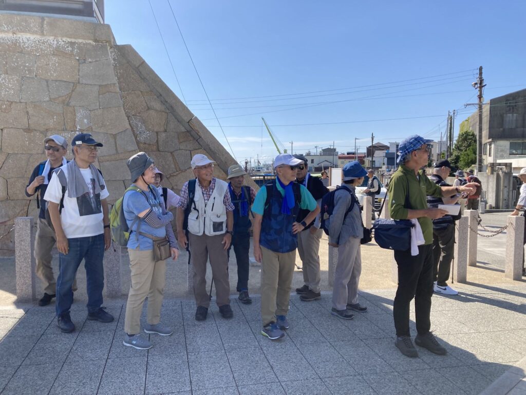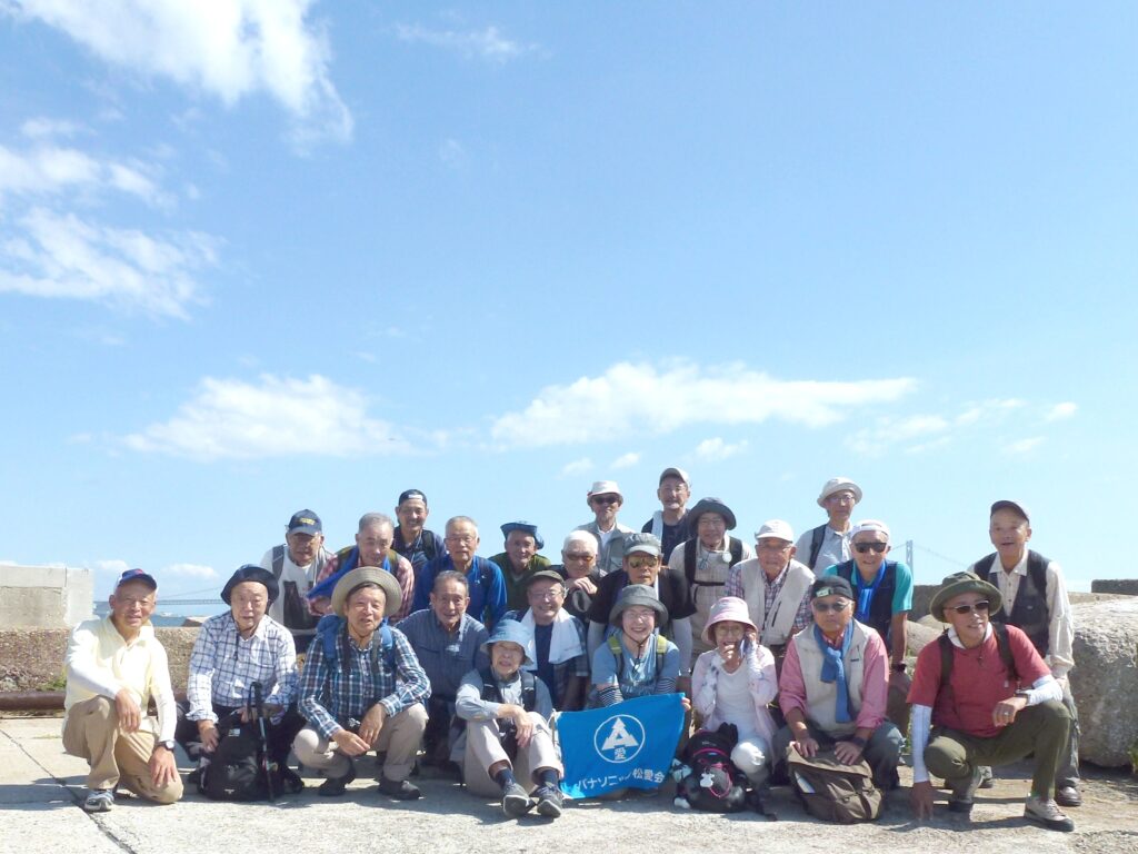9月30日(火)に9月例会が開催されました。今回は、第332回「城跡となぎさ海道散策」と題し、晴天に恵まれ、会員18名、世話役6名、総勢24名の方に参加いただきました。