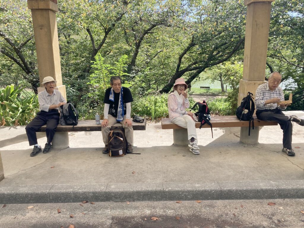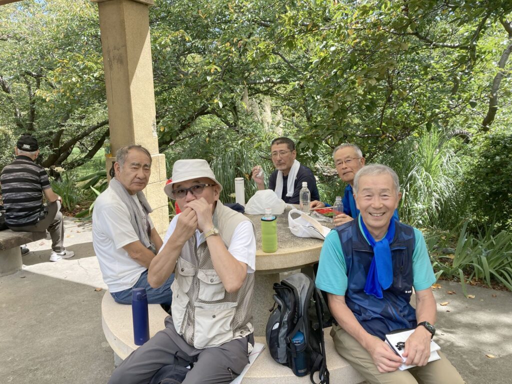 「明石城跡」で街の景観を楽しみ集合写真を撮った後、11時30分に「剛ノ池」に向かいました。11時45分に「剛ノ池」に到着し、そこで昼食としました。