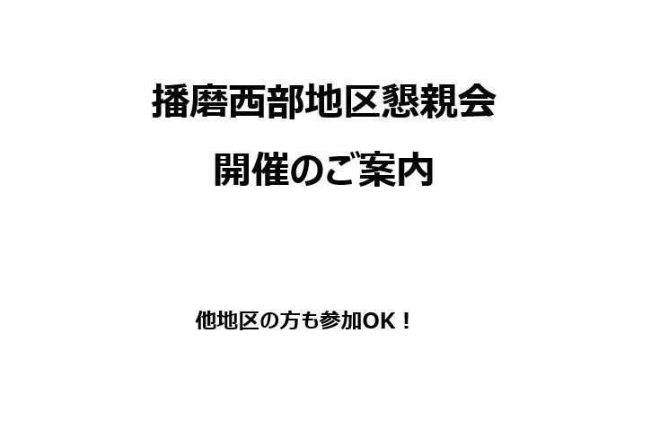 参加希望の方は以下のメールアドレスに「播磨西部地区懇親会への参加希望」と記入の上、「お名前」「お住まいの郵便番号」「日中連絡のとれる連絡先(電話/携帯番号)」を明記して電子メールをお願いします。 メールアドレス: bye02466@gmail.com(兵庫西支部 播磨西部担当)西田まで