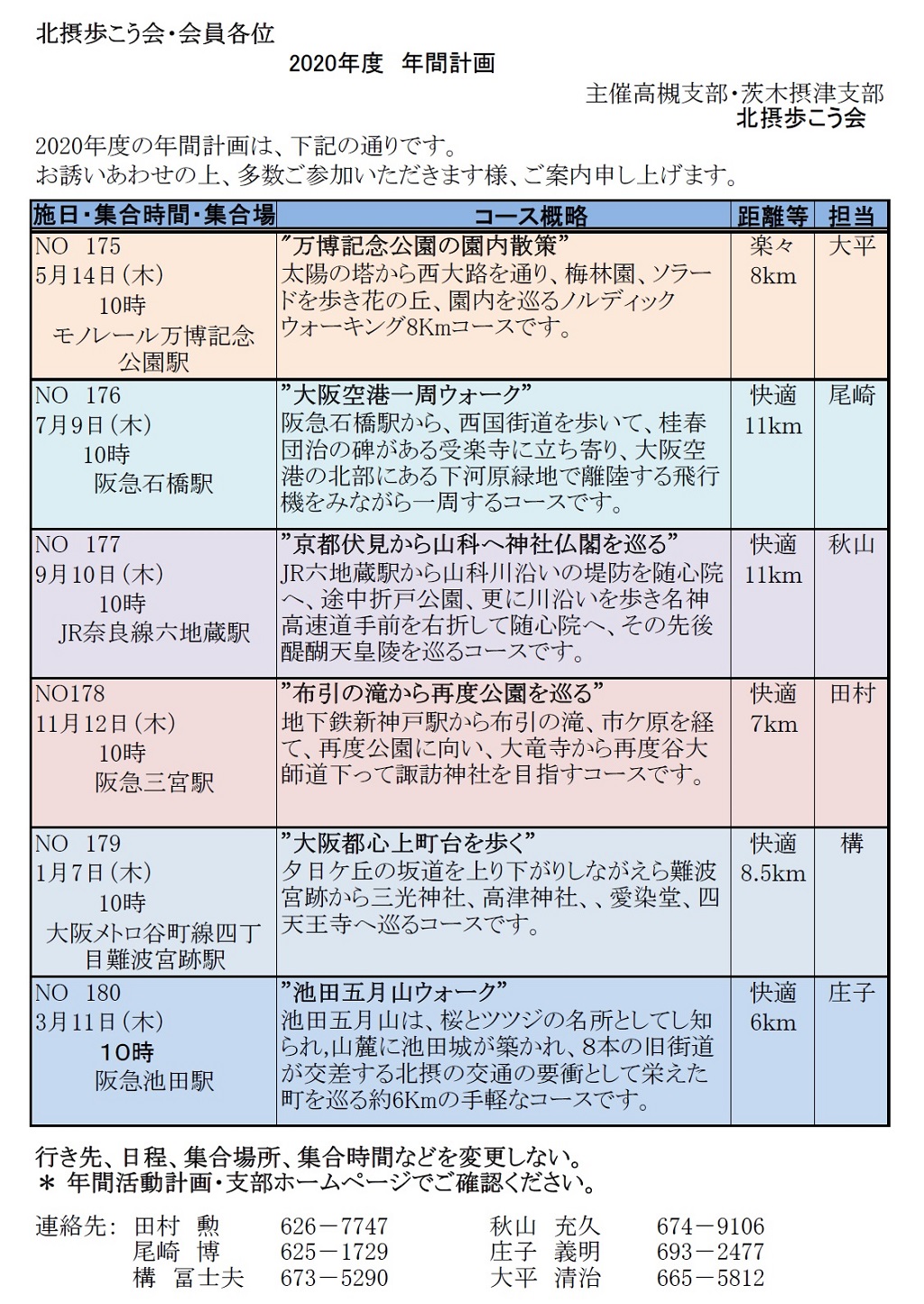 北摂歩こう会 2020年度 年間計画表