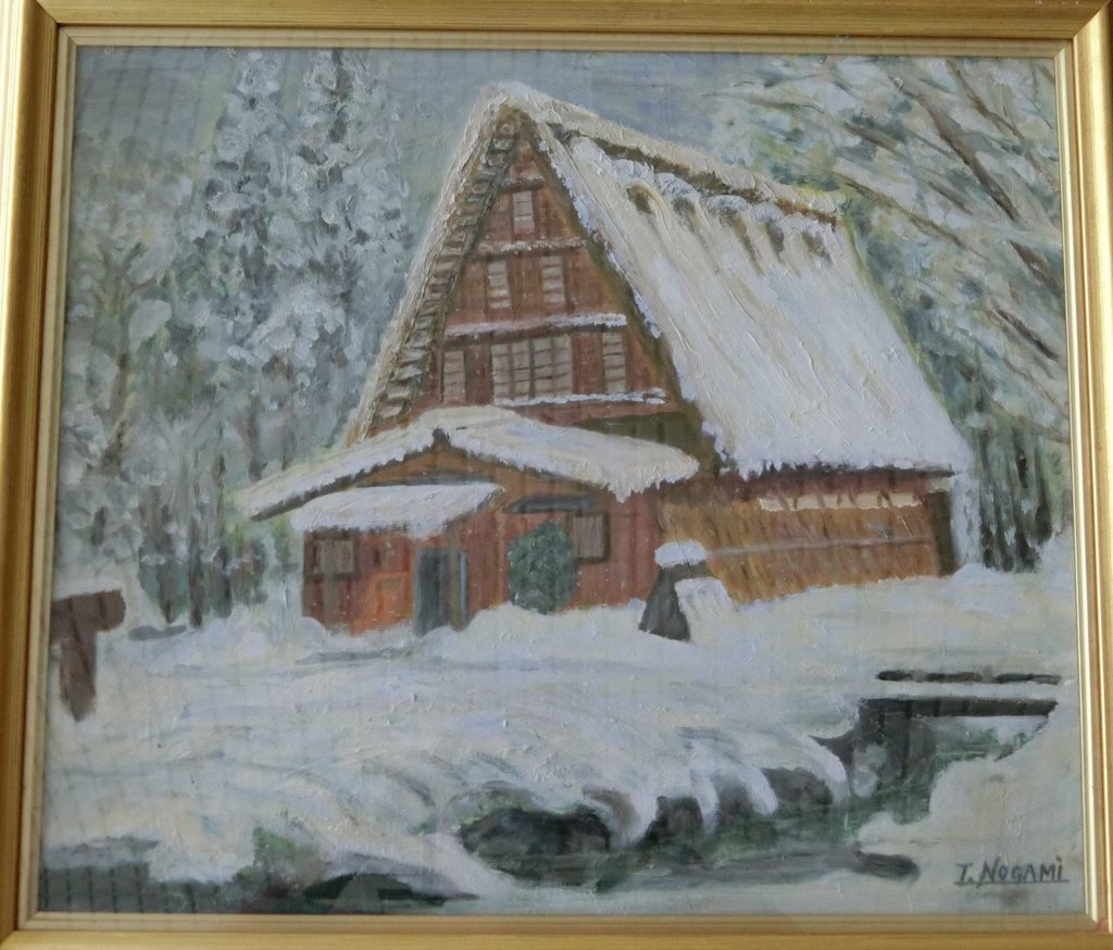 【解 説】坂の町尾道の西国寺は健脚祈願の寺として知られています。山門には大きな草鞋がかけてあり、高さはおよそ2m。草履の陰に隠れ、中の仁王を見ることができませんが、仁王の健脚にあやかろうと祈願した善男善女は小さなわらじを授かり、それを仁王門にかけて帰ります。かなりの石段がありますので、登り降りに足を鍛えられるとは間違いありません。大草鞋と小わらじの対比を描き、尾道四季展で賞を戴きました。