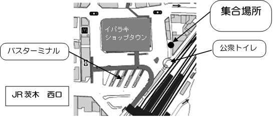 2.集合場所:JR茨木西口(バスターミナル側)公衆トイレ前広場(下図参照)
