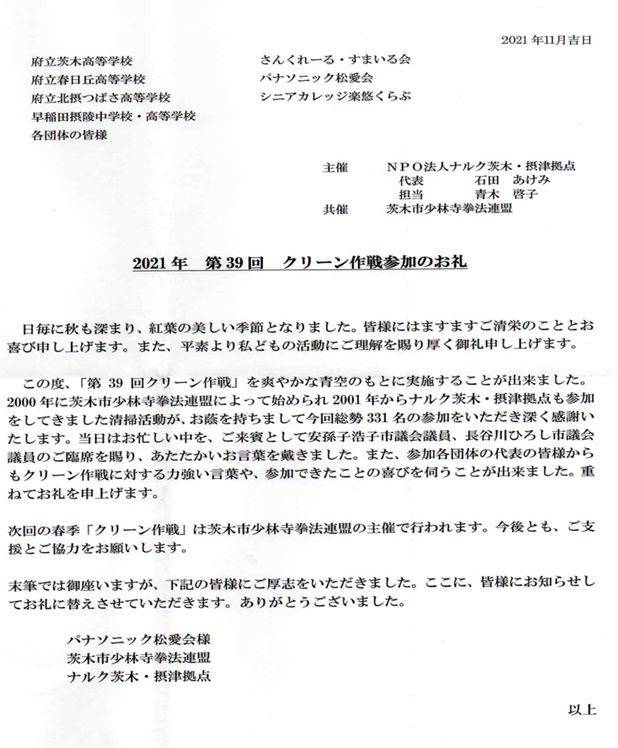 2021.11.12 お知らせ, 支部からのお知らせ, 本部掲載 市街地クリーン大作戦に対する主催者よりのお礼状紹介 11月7日(日曜日)開催の”市街地クリーン大作戦”に対して主催者のNPO法人ナルク茨木・摂津拠点 代表(石田 あけみ様)、担当者(青木 啓子様)よりお礼状が届きましたのでご紹介致します。 2021年11月7日市街地クリーン大作戦より お知らせ, 支部からのお知らせ, 本部掲載 コメント: 0