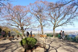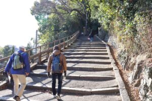 本殿でのお参りのあと、エジソン記念碑のある広場を散策し、展望台へ(京都盆地が一望に見えて絶景・集合写真)。その後裏参道(急な石段)を下り、背割提着く(昼食・懇談)