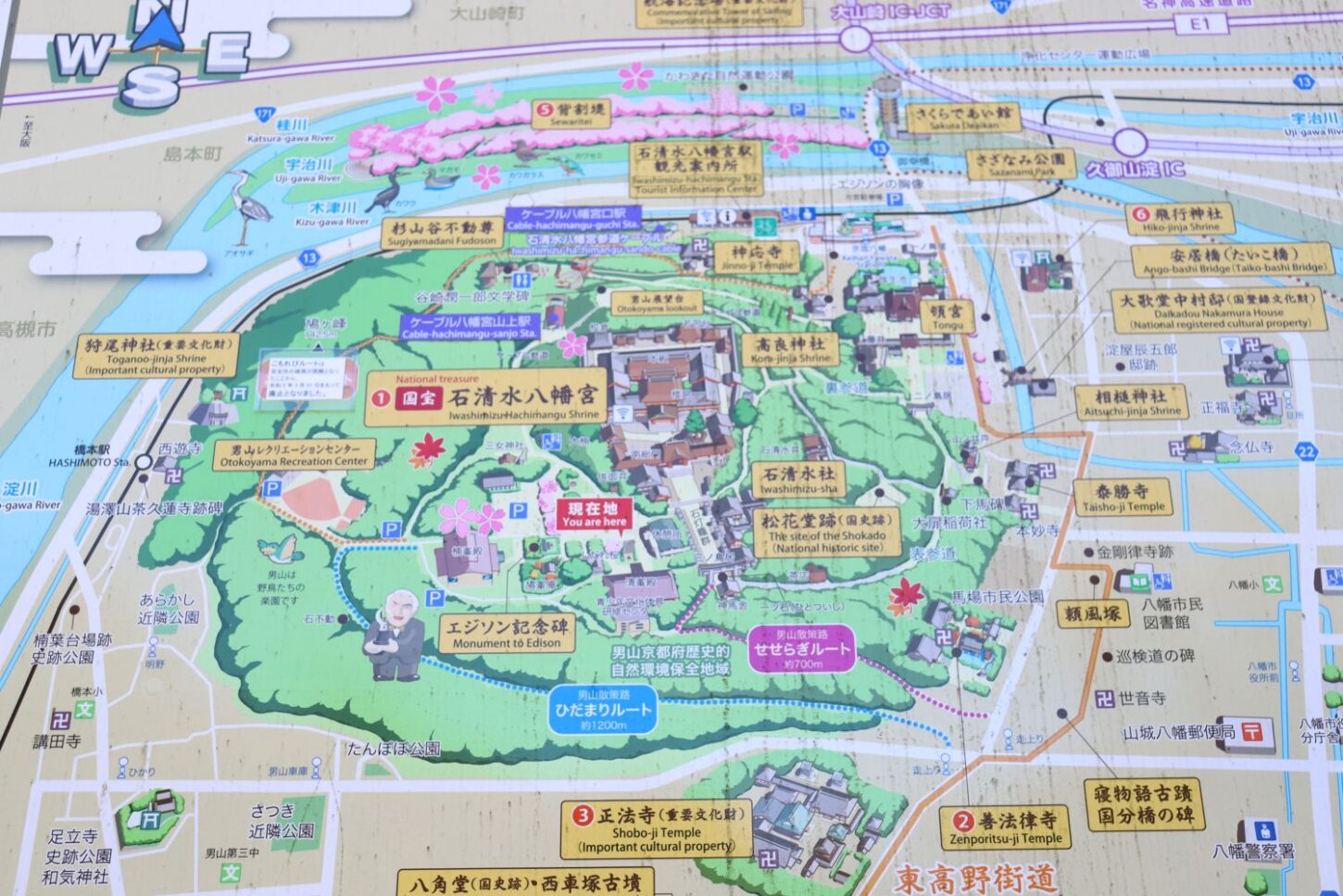 ◇コース 京阪石清水八幡駅10:10→八幡宮入り口(コース説明・ストレッチ体操)10:15→表参道→本殿10:30→エジソン記念碑広場10:50→展望台・集合写(眺望)11:20→裏参道→背割提(昼食12:00)→12:40(出発)→背割提先端13:10(先端往復2.4km)→さくらであい館(トイレ・休憩・展望タワー)14:00 解散