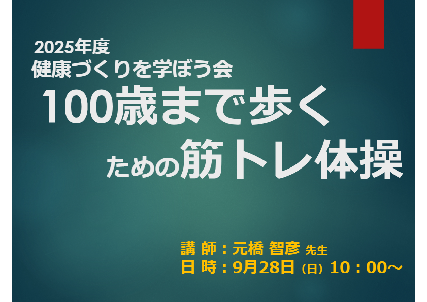 いただいている元橋講師をお迎えして「100歳まで歩くための筋トレ体操」を開催します。