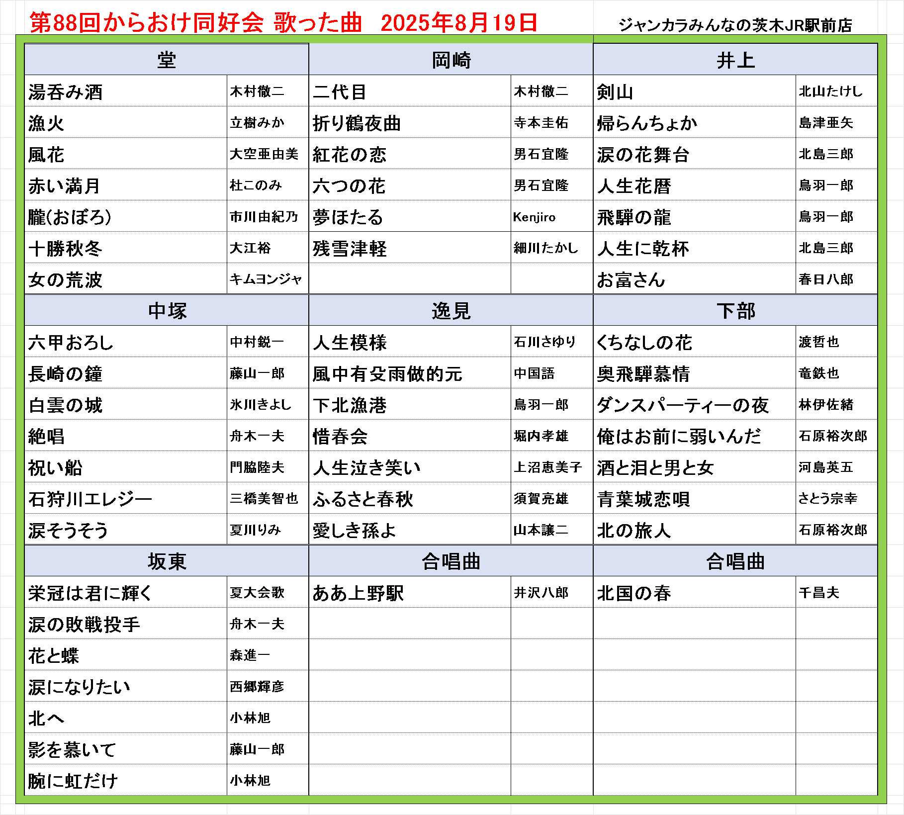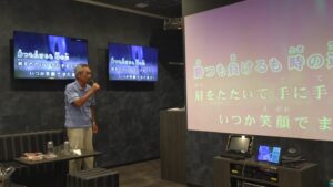 今月の例会は当初の予定を変えて移動や集まりに便利、冷房の効いた設備のいい駅前ジャンカラで実施しました。いつもの様に初めて聞く新曲ばかりの人、「50年前か?たぶん何歳頃だから戦後だ。」等と話しながら、