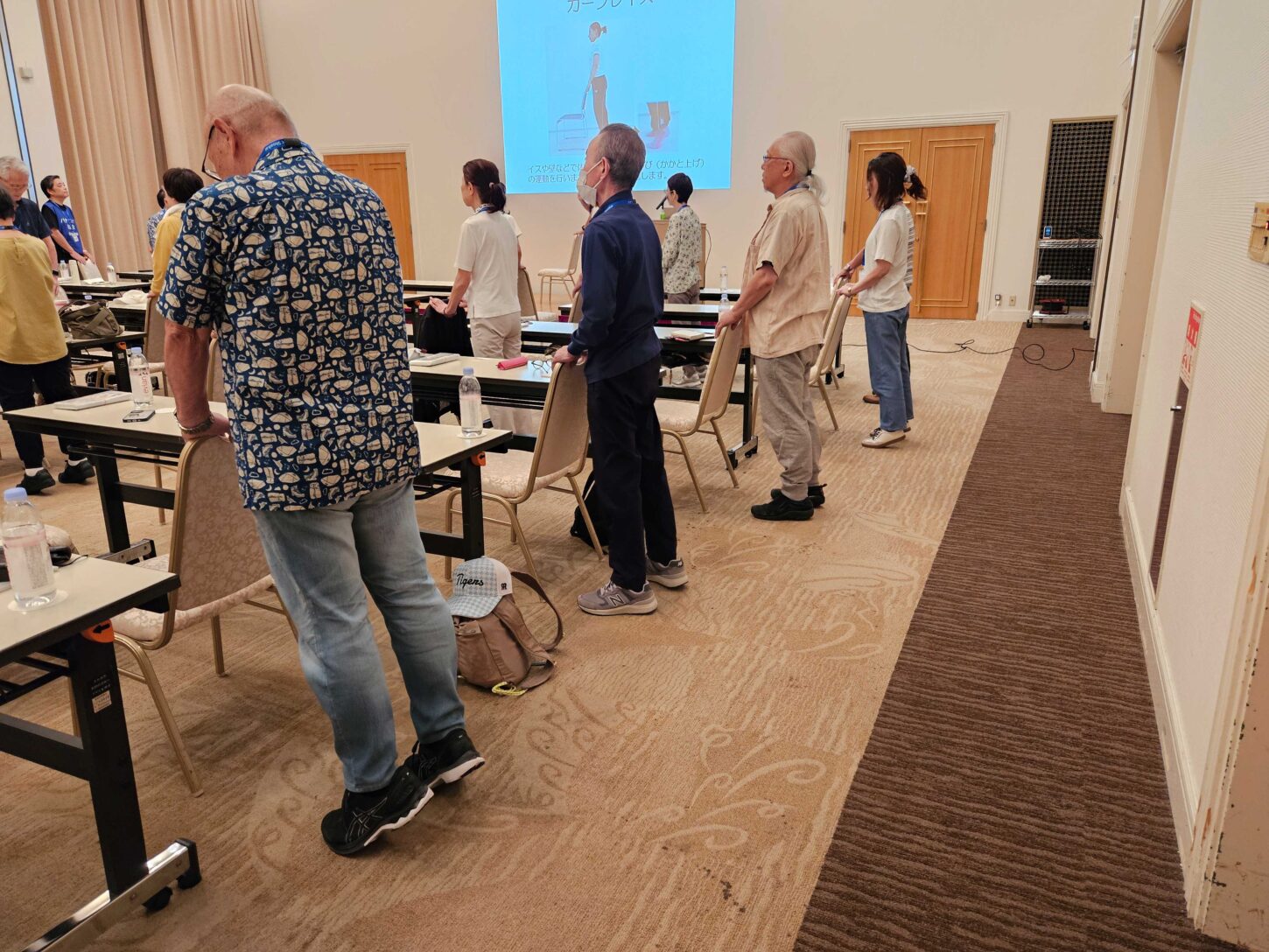 実技では、トレーニングの原則や注意点を理解したうえで、椅子を使ったストレッチからスタート。「太もも前・裏のストレッチ」「空気いすテスト」「股関節の体操」「脚上げ運動」「カーフレイズ(かかと上げ)」「スクワット」「バランストレーニング」「足指のトレーニング」など、途中にストレッチを挟みながら、じっくり・しっかりと体を動かしました。